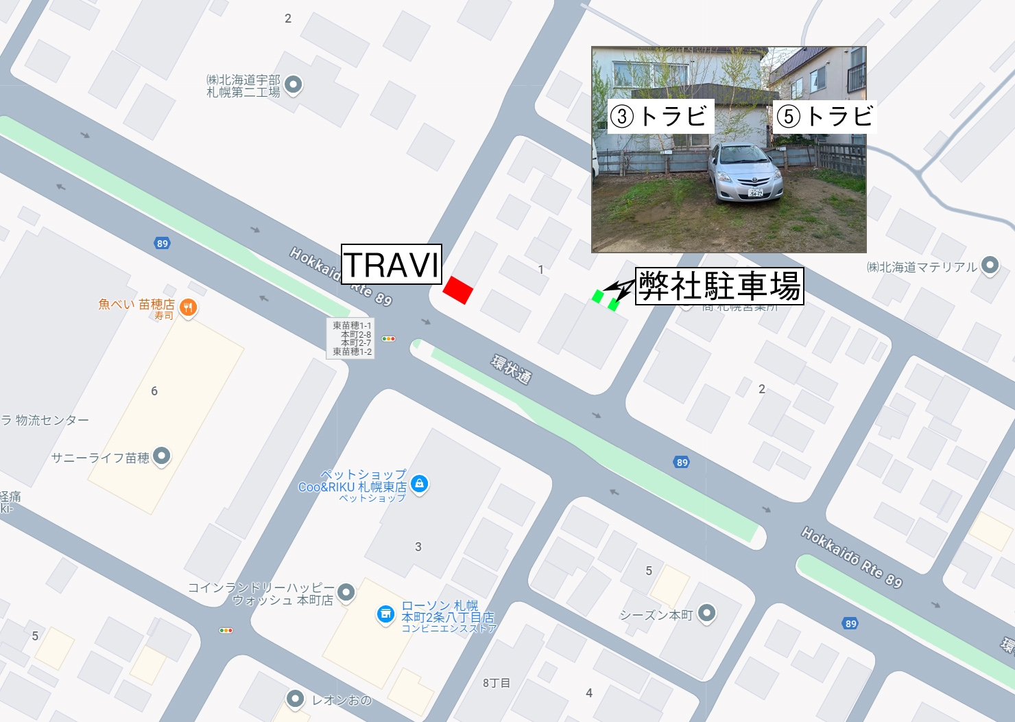 弊社指定駐車場 下記③番⑤番(2台分あり)※満車の際はご連絡下さい 011-558-4231